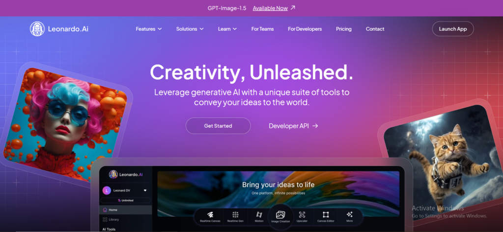 Leonardo AI is an advanced AI image generation platform that allows users to create stunning images from text prompts, refine outputs using presets and models, and even train custom models for consistent results. Unlike basic generators, Leonardo AI focuses on precision, style control, and professional use cases, making it a strong choice for serious creators.
