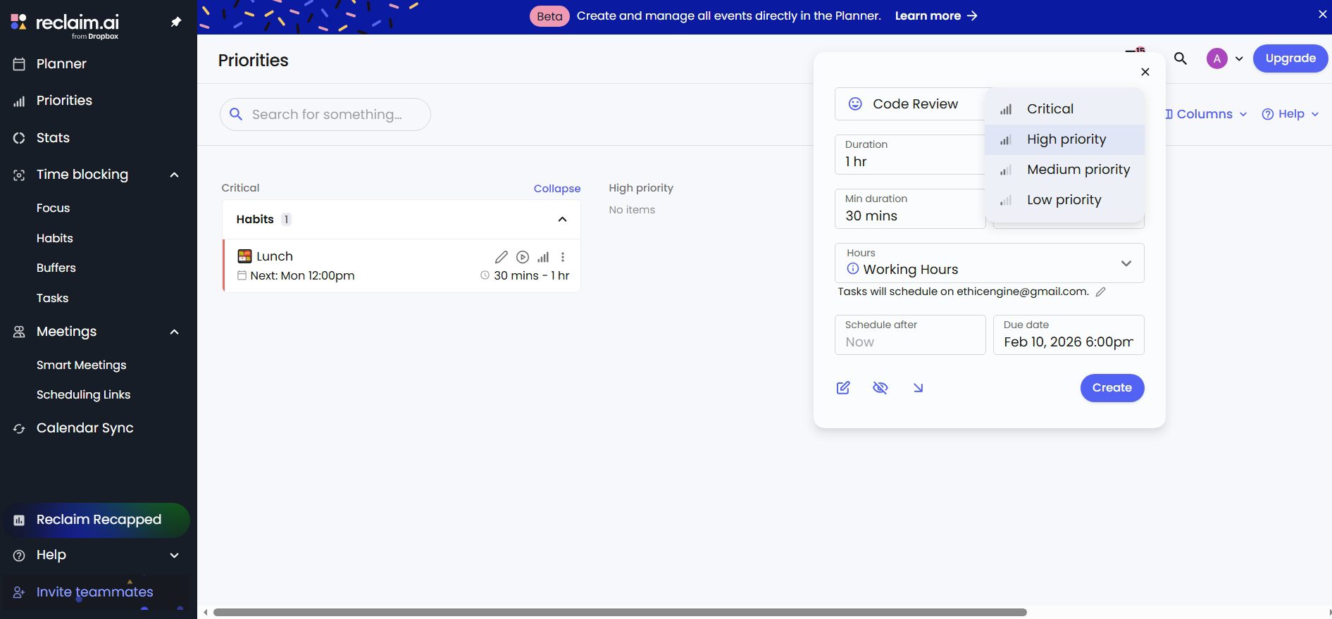 - How it helps: Reclaim can automatically turn your tasks into calendar events based on your available time and priority.